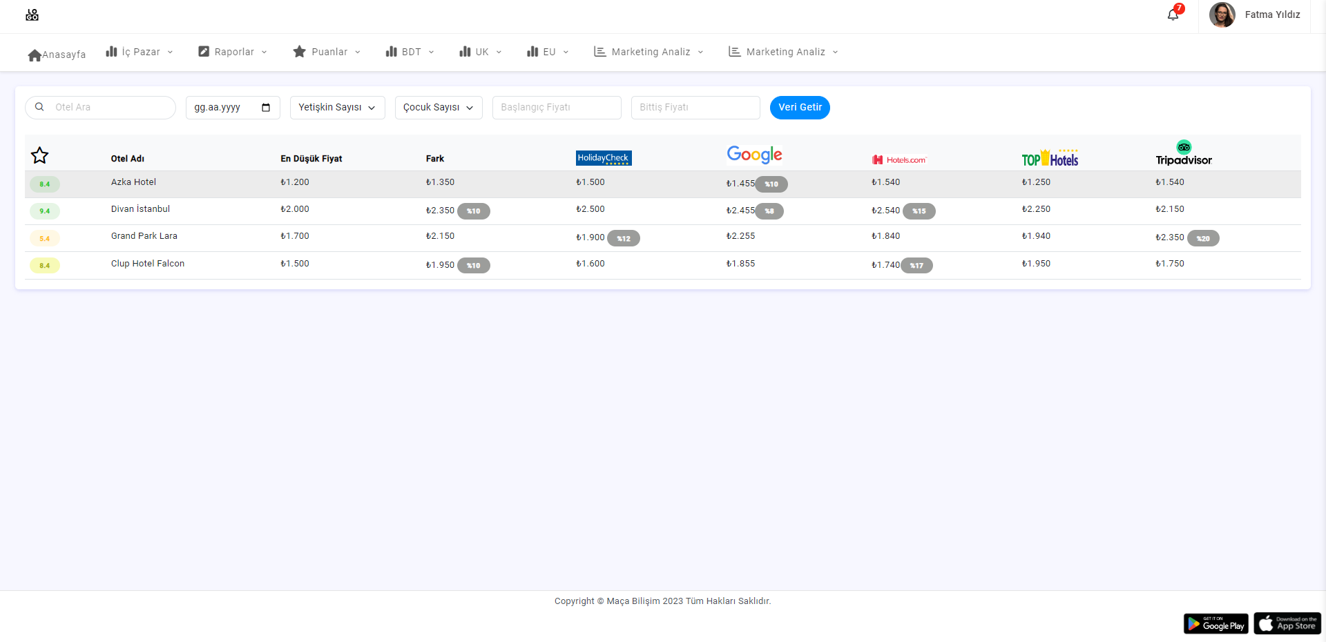 anlık ve haftalık fiyatlarına erişim